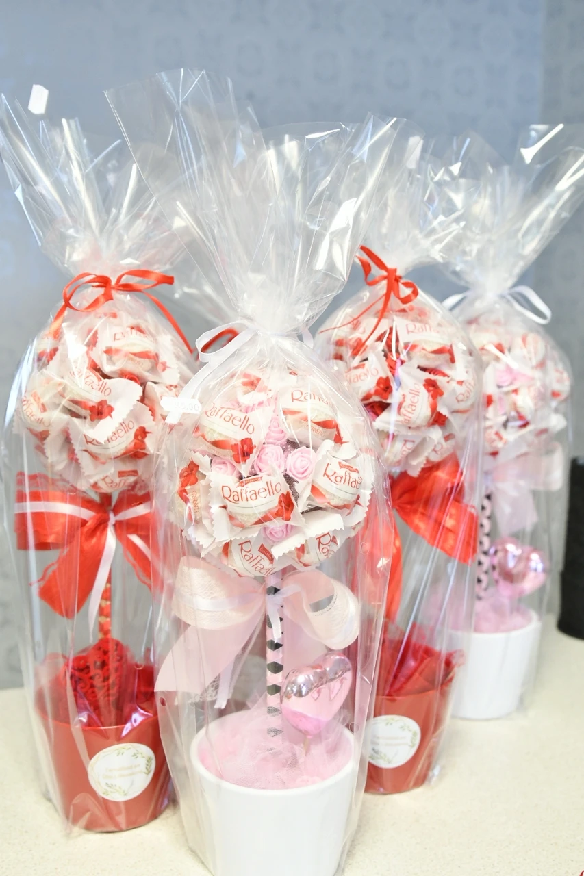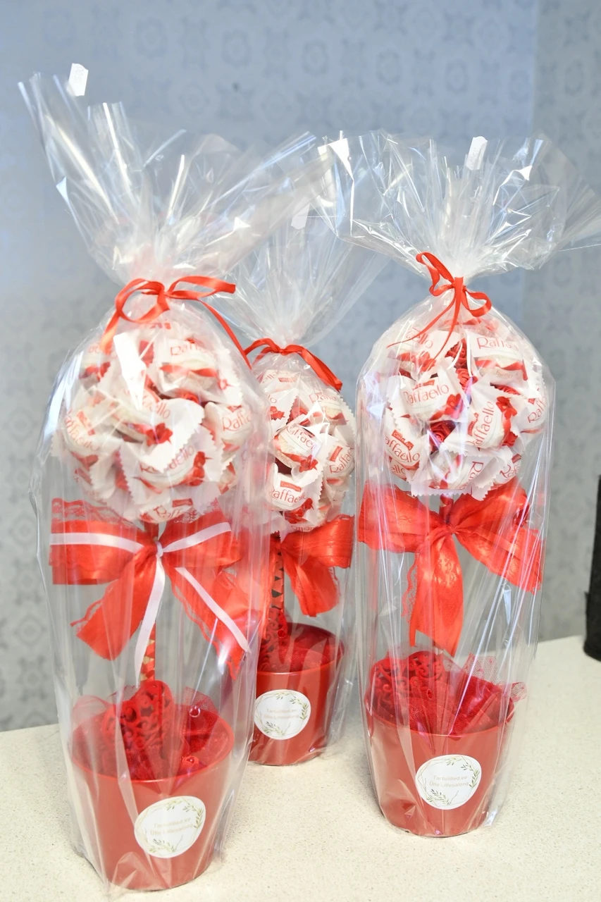 Kuna tegemist on siiski käsitööga, on iga puu ainulaadne. Kasutame vahuroose ja kommipuu pakime kingitusena tsellofaani.